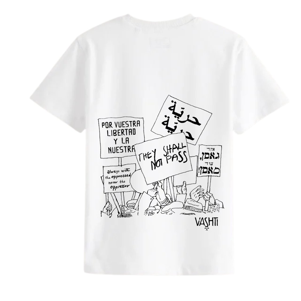 White short sleeve tee with protest chants and slogans from the last 125 years of the Jewish left.